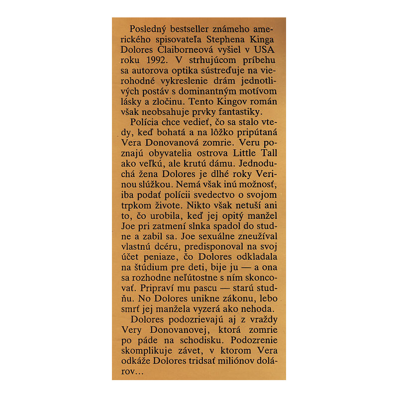 Polícia chce vedieť, čo sa stalo vtedy, keď bohatá a na lôžko pripútaná Vera Donovanová zomrie. Veru poznajú obyvatelia ostrova Little Tall ako veľkú, ale krutú dámu. Jednoduchá žena Dolores je dlhé roky Verinou slúžkou. Nemá však inú možnosť, iba podať polícii svedectvo o svojom trpkom živote...