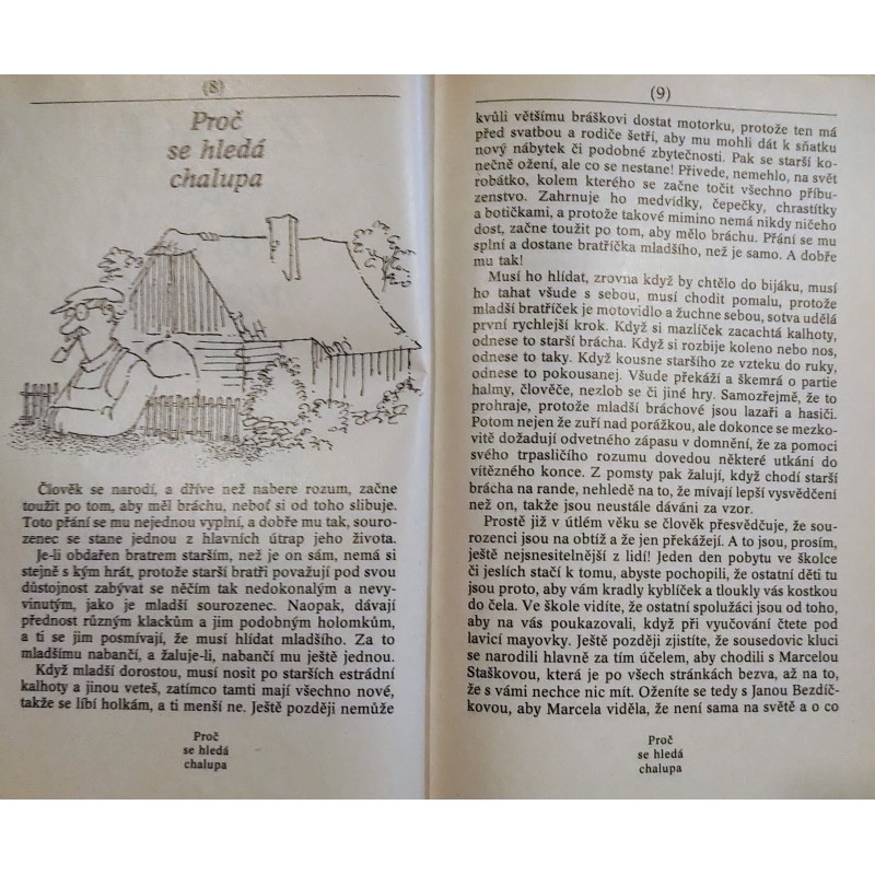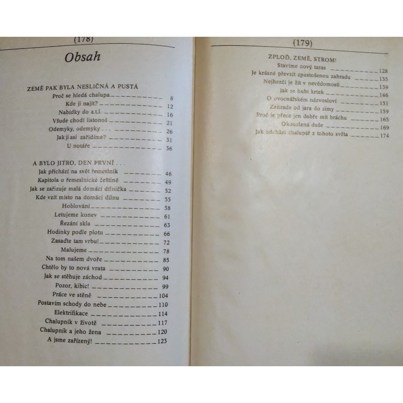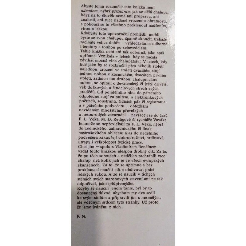 Abyste tomu rozuměli: tato knížka není návodem, nýbrž přiznáním jak se dělá chalupa, když na to člověk nemá ani průpravu, ani znalosti, ani ruce nadané vrozenou obratností, a pokouší se to všechno překlenout nadšením, vírou a láskou. Kdybyste toto upozornění přehlédli, mohli byste se svou chalupou špatně skončit, třebaže začínáte velice dobře — vyhledáváním odborné literatury a touhou po sebevzdělání. Tahle knížka není ani tak odborná, jako spíš upřímná. Vznikala v letech, kdy se začala zdvihat mocná vlna chalupářství. V letech, kdy lidé jako by se rozkročili přes několik století najednou: zrozeni ve století dvacátém stojí jednou nohou v kosmickém, dvacátém prvním století, zatímco tou druhou, chalupnickou nohou, se opírají o devatenáctý či ještě dřívější věk doškových a šindelových střech svých pradědů. Od pondělního rána do pátečního odpoledne stojí za pultem, u elektronkových počítačů, soustruhů, řídicích pák či registratur a v pátečním podvečeru — obtěžkáni nevídaným množstvím převelkých a nesourodých zavazadel — navracejí se do časů F. L. Věka, M. D. Rettigové či rychtáře Vaváka. Jenomže se nepřevlékají za F. L. Věka, nýbrž do zednického, zahradnického či jinak hastrošovitého oblečení a až do nedělního podvečera zakoušejí dobrodružství, hrdinství, útrapy i velkolepost fyzické práce.