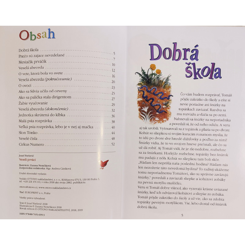Z obsahu: Dobrá škola Prečo sú zajace nevzdelané Mesiačik prváčik Veselá abeceda O vete, ktorá bola vo svete Veselá abeceda (pokračovanie) O ovocí Ako sa Silvia učila od ozveny Ako sa palička stala dirigentom Žabie vyučovanie Veselá abeceda (dokončenie) Jednotka skrútená do klbka Malá psia rozprávka ...