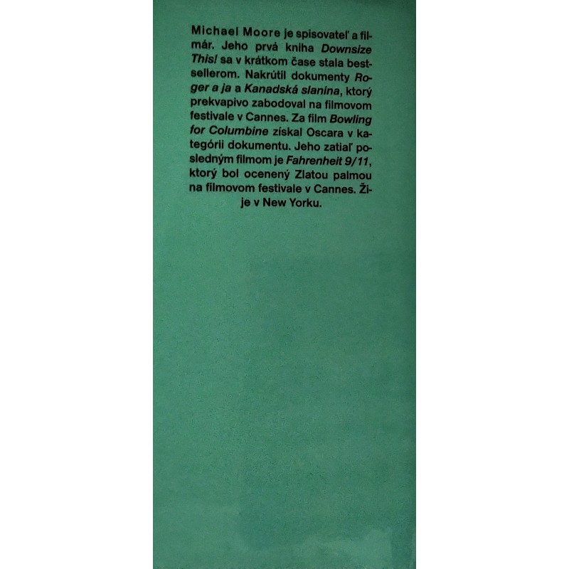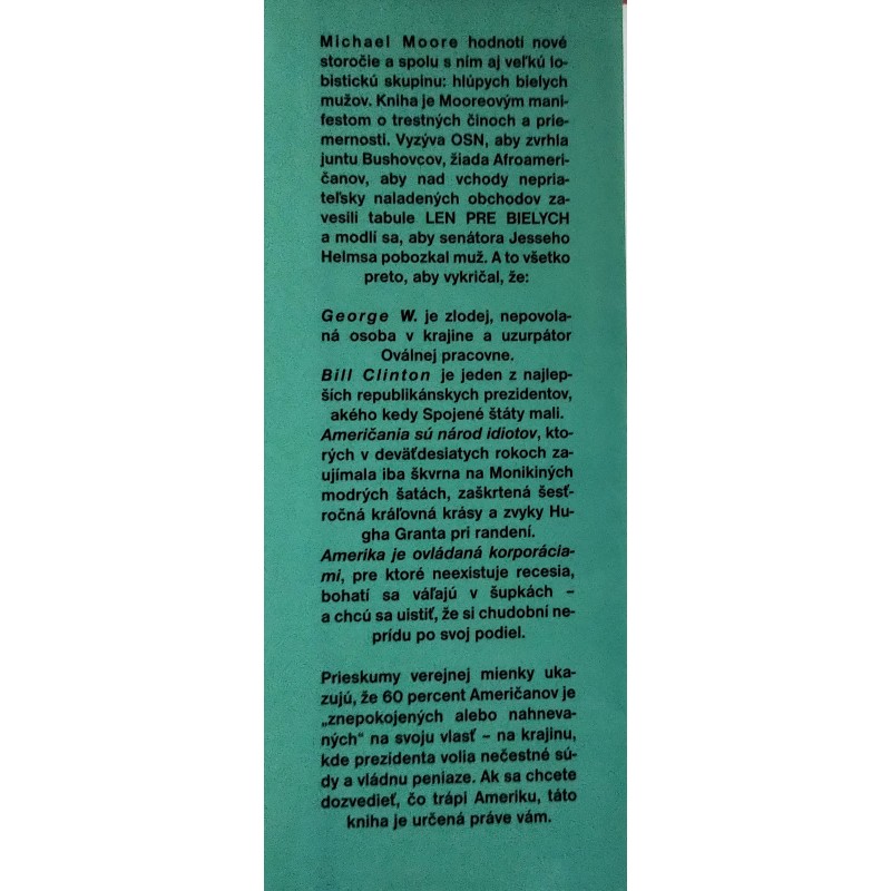Michael Moore hodnotí nové storočie a spolu s ním aj veľkú lobistickú skupinu: hlúpych bielych mužov. Kniha je Mooreovým manifestom o trestných činoch a priemernosti. Vyzýva OSN, aby zvrhla juntu Bushovcov, žiada Afroameričanov, aby nad vchody nepriateľsky naladených obchodov zavesili tabule LEN BELOSI a modlí sa, aby senátora Jesseho Helmsa pobozkal muž. A to všetko preto, aby vykričal, že: