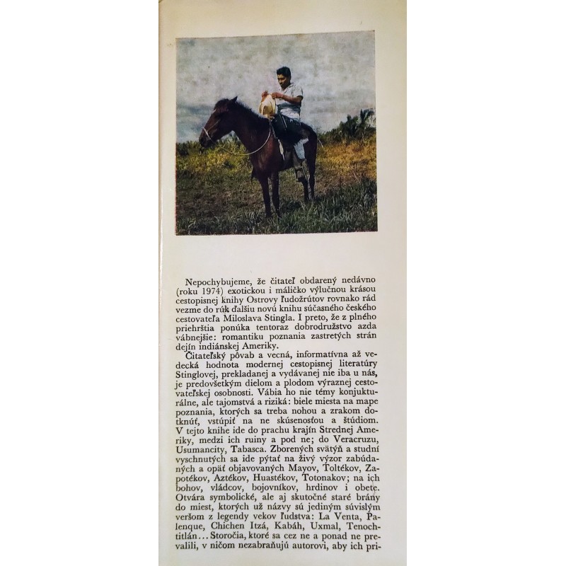Nepochybujeme, že čitateľ obdarený nedávno (roku 1974) exotickou i máličko výlučnou krásou cestopisnej knihy Ostrovy ľudožrútov rovnako rád vezme do rúk ďalšiu novú knihu súčasného českého cestovateľa Miloslava Stingla. I preto, že z plného priehrštia ponúka tentoraz dobrodružstvo azda vábnejšie: romantiku poznania zastretých strán dejín indiánskej Ameriky.
