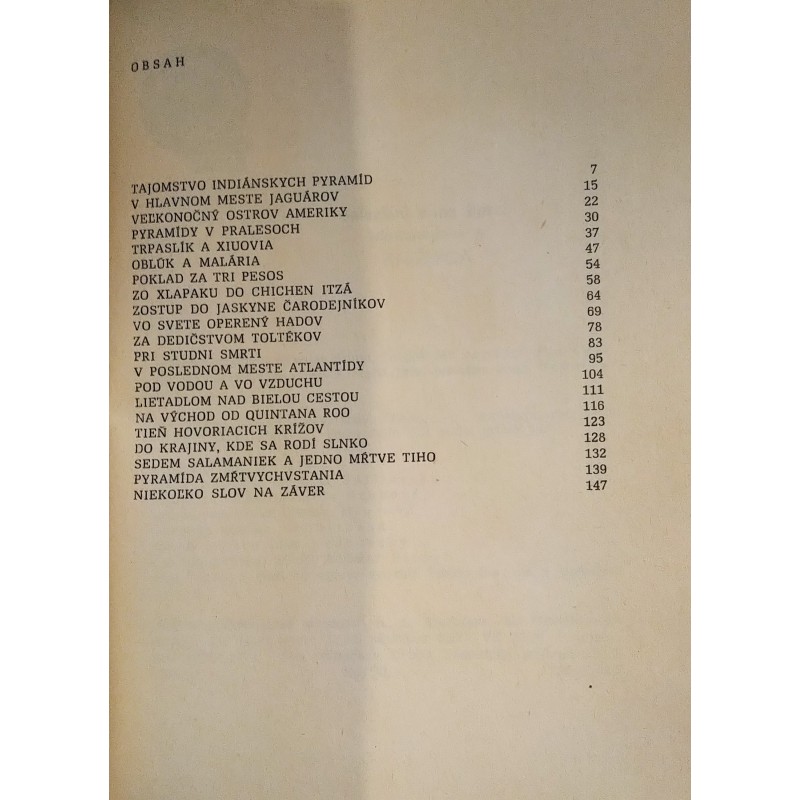 Z obsahu : Tajomstvo indiánskych pyramíd * V hlavnom meste jaguárov * Veľonočný ostrov Ameriky * Pyramídy v pralesoch * Poklad za tri pesos * Pri studni smrti * Pod vodou a vo vzduchu * Na východ od Quintana Roo * Tieň hovoriacich krížov * Do krajiny, kde sa rodí slnko * Sedem Salamaniek a jedno mŕtve Tiho * Pyramída zmŕtvychvstania * a mnohé ďalšie.