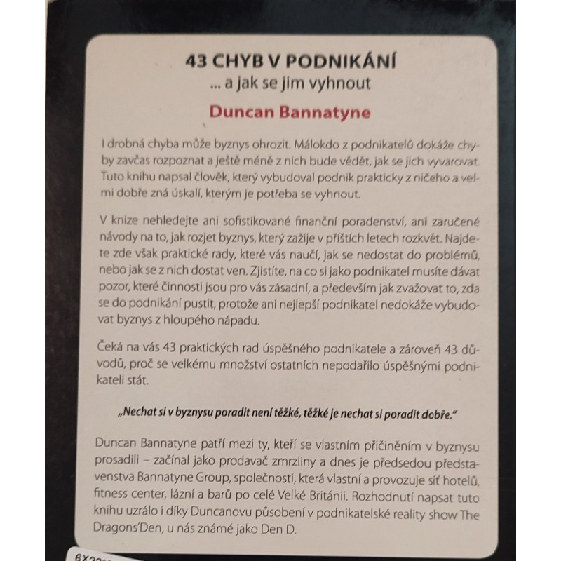 V byznysu se chyby nevyplácejí. To ví asi každý, kdo se alespoň jednou pokusil podnikat. Málokdo však ví, jaké bývají nejčastější chyby, kterých se podnikatelé dopouštějí, a ještě méně je těch, kteří vědí, jak se těmto chybám nejlépe vyhnout. Duncan Bannatyne patří mezi ty, kteří se vlastním přičiněním v byznysu prosadili – začínal jako prodavač zmrzliny a dnes je předsedou představenstva Bannatyne Group, společnosti, která vlastní a provozuje síť hotelů, fitness center, lázní a barů po celé Velké Británii. Rozhodnutí napsat tuto knihu uzrálo i díky Duncanovu působení v podnikatelské reality show The Dragons'Den, u nás známé jako Den D: pět investorů si vyslechne podnikatelský záměr a rozhoduje se, zda do něj vloží vlastní finance nebo ne. Duncan Bannatyne je ale autorem již jednoho bestselleru – jeho kniha Anyone Can Do It (Každý to může dokázat) se prodala v nákladu přes 200 tisíc kusů.