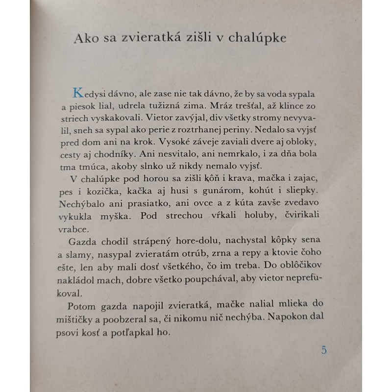 Kedysi dávno, ale zase nie tak dávno, že by sa voda sypala a piesok lial, udrela tužizná zima. Mráz trešťal, až klince zo striech vyskakovali. Vietor zavýjal, div všetky stromy nevyvalil, sneh sa sypal ako perie z roztrhanej periny…