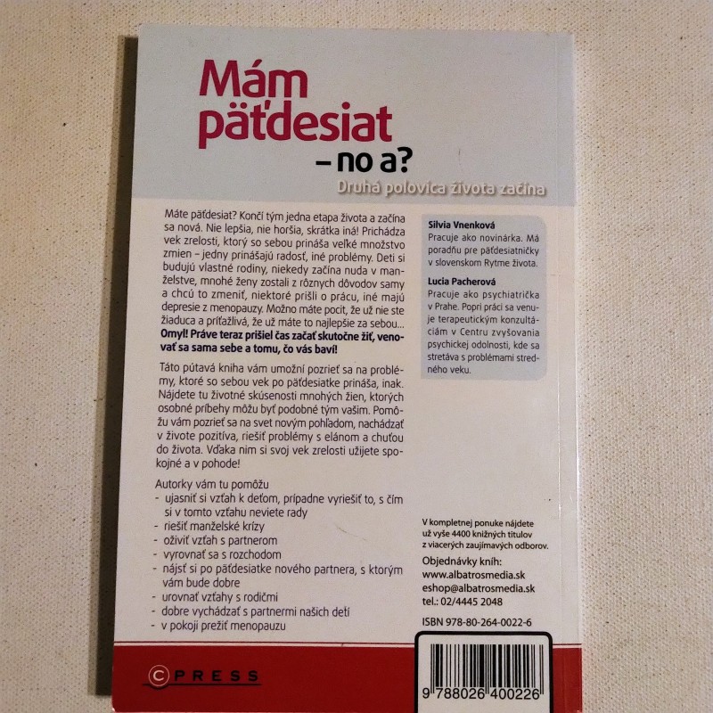 Máte päťdesiat? Končí tým jedna etapa života a začína sa nová. Nie lepšia, nie horšia, skrátka iná! Prichádza vek zrelosti, ktorý so sebou prináša veľké množstvo zmien – jedny prinášajú radosť, iné problémy. Deti si budujú vlastné rodiny, niekedy začína nuda v manželstve, mnohé ženy zostali z rôznych dôvodov samy a chcú to zmeniť, niektoré prišli o prácu, iné majú depresie z menopauzy. Možno máte pocit, že už nie ste žiaduca a príťažlivá, že už máte to najlepšie za sebou... Omyl! Práve teraz prišiel čas začať skutočne žiť, venovať sa sama sebe a tomu, čo vás baví! Táto pútavá kniha vám umožní pozrieť sa na problémy, ktoré so sebou vek po päťdesiatke prináša, inak. Nájdete tu životné skúsenosti mnohých žien, ktorých osobné príbehy môžu byť podobné tým vašim. Pomôžu vám pozrieť sa na svet novým pohľadom, nachádzať v živote pozitíva, riešiť problémy s elánom a chuťou do života. Vďaka nim si svoj vek zrelosti užijete spokojné a v pohode!