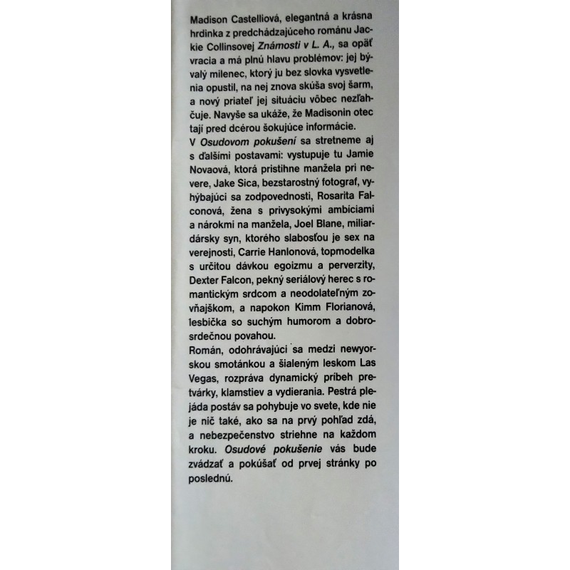 Madison Castelliová, elegantná a krásna hrdinka z románu Známosti v L. A., sa opäť vracia a má plnú hlavu problémov: jej bývalý milenec, ktorý ju bez slovka vysvetlenia opustil, na nej znovu skúša svoj šarm, a nový priateľ jej situáciu vôbec neuľahčuje. Navyše sa ukáže, že Madisonin otec tají pred dcérou šokujúce informácie...