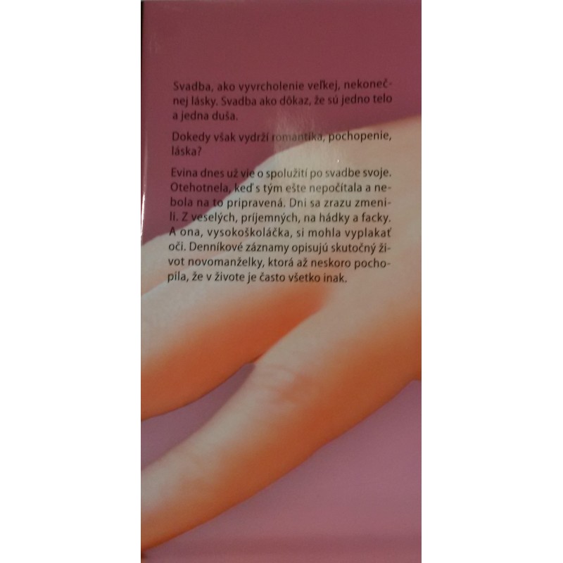 Svadba, ako vyvrcholenie veľkej, nekonečnej lásky. Svadba ako dôkaz, že sú jedno telo a jedna duša. Dokedy však vydrží romantika, pochopenie, láska? Evina dnes už vie o spolužití po svadbe svoje. Otehotnela, keď s tým ešte nepočítala a nebola na to pripravená. Dni sa zrazu zmenili. Z veselých, príjemných, na hádky a facky. A ona, vysokoškoláčka, si mohla vyplakať oči. Denníkové záznamy opisujú skutočný život novomanželky, ktorá až neskoro pochopila, že v živote je často všetko inak.