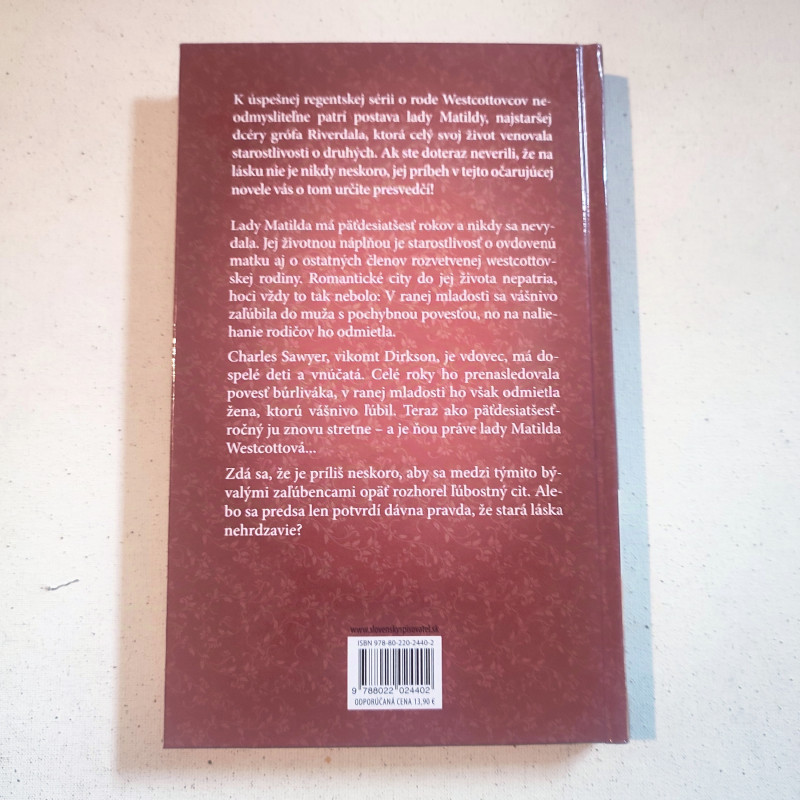 K úspešnej regentskej sérii o rode Westcottovcov neodmysliteľne patrí postava lady Matildy, najstaršej dcéry grófa Riverdala, ktorá celý svoj život venovala starostlivosti o druhých. Ak ste doteraz neverili, že na lásku nie je nikdy neskoro, jej príbeh v tejto očarujúcej novele vás o tom určite presvedčí!