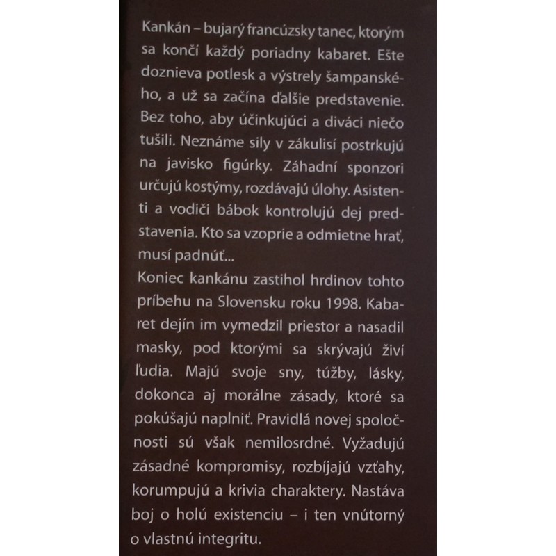 Koniec kankánu zastihol hrdinov tohto príbehu na Slovensku roku 1998. Kabaret dejín im vymedzil priestor a nasadil masky, pod ktorými sa skrývajú živí ľudia. Majú svoje sny, túžby, lásky, dokonca aj morálne zásady, ktoré sa pokúšajú naplniť. Pravidlá novej spoločnosti sú však nemilosrdné. Vyžadujú zásadné kompromisy, rozbíjajú vzťahy, korumpujú a krivia charaktery. Nastáva boj o holú existenciu – i ten vnútorný o vlastnú integritu.