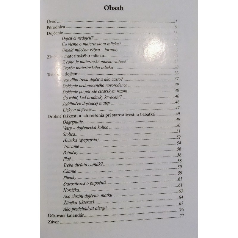Kniha určená najmä budúcim mamičkám ako aj tým, ktorí si práve priniesli domov bábätko. Kniha rozoberá témy: Dojčiť či nedojčiť? Čo vieme o materskom mlieku, Technika dojčenia, Ako dlho treba dojčiť a ako často...