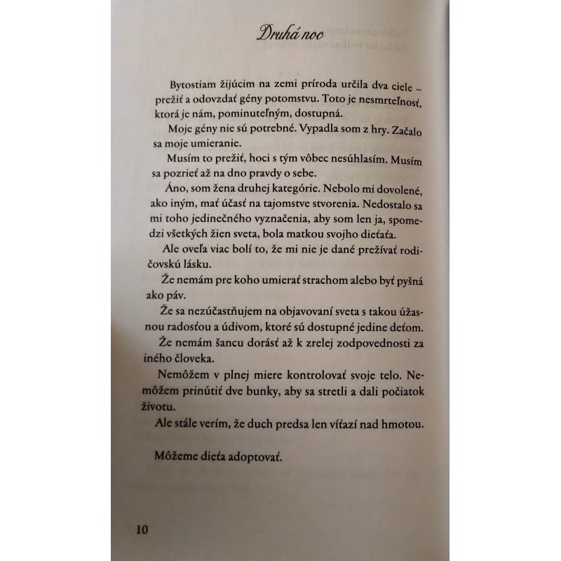 Autorka v knihe výnimočne sugestívnym spôsobom rozpráva o vlastnej skúsenosti s adopciou dieťaťa. Najprv ponúka veľmi intímny pohľad do vnútra neplodnej ženy. Opisuje rozhodnutie pre adopciu a samotný proces osvojenia dieťaťa. Podstatnú časť knihy tvorí množstvo kratučkých kapitol z rodinného života s adoptovaným synom Peťom. Odhaľuje nám nový rozmer materstva a dáva možnosť preniknúť do sveta detí z detského domova. Ten nám je – hoci sa o ňom mnoho hovorí – stále úplnou neznámou.