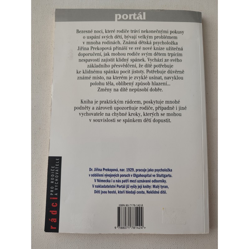 Bezesné noci, které rodiče tráví nekonečnými pokusy o uspání svých dětí, bývají velkým problémem v mnoha rodinách. Známá dětská psycholožka Jiřina Prekopová přináší ve své knize užitečné doporučení, jak mohou rodiče svým dětem trpícím nespavostí zajistit klidný spánek. Autorka vychází ze svého přesvědčení, že pro dítě je ke spánku důležitý pocit jistoty. Potřebuje důvěrně známé místo, na kterém je zvyklé usínat, navyklou pohodu těla, oblíbený způsob hlazení...